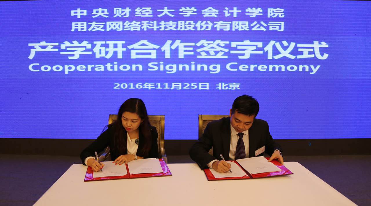 【2016年11月25日.北京.中央財(cái)經(jīng)大學(xué)】本著平等互利,共同發(fā)展,優(yōu)勢(shì)互補(bǔ)的原則,用友網(wǎng)絡(luò)科技股份有限公司與中央財(cái)經(jīng)大學(xué)會(huì)計(jì)學(xué)院一致同意建立全面的產(chǎn)、學(xué)、研合作關(guān)系,并在中央財(cái)經(jīng)大學(xué)隆重舉行雙方產(chǎn)學(xué)研合作協(xié)議簽字儀式。用友網(wǎng)絡(luò)助理總裁付建華女士、中央財(cái)經(jīng)大學(xué)會(huì)計(jì)學(xué)院院長(zhǎng)袁淳先生出席并代表雙方簽字,簽字儀式由中央財(cái)經(jīng)大學(xué)會(huì)計(jì)學(xué)院黨委書(shū)記劉俊勇先生主持。